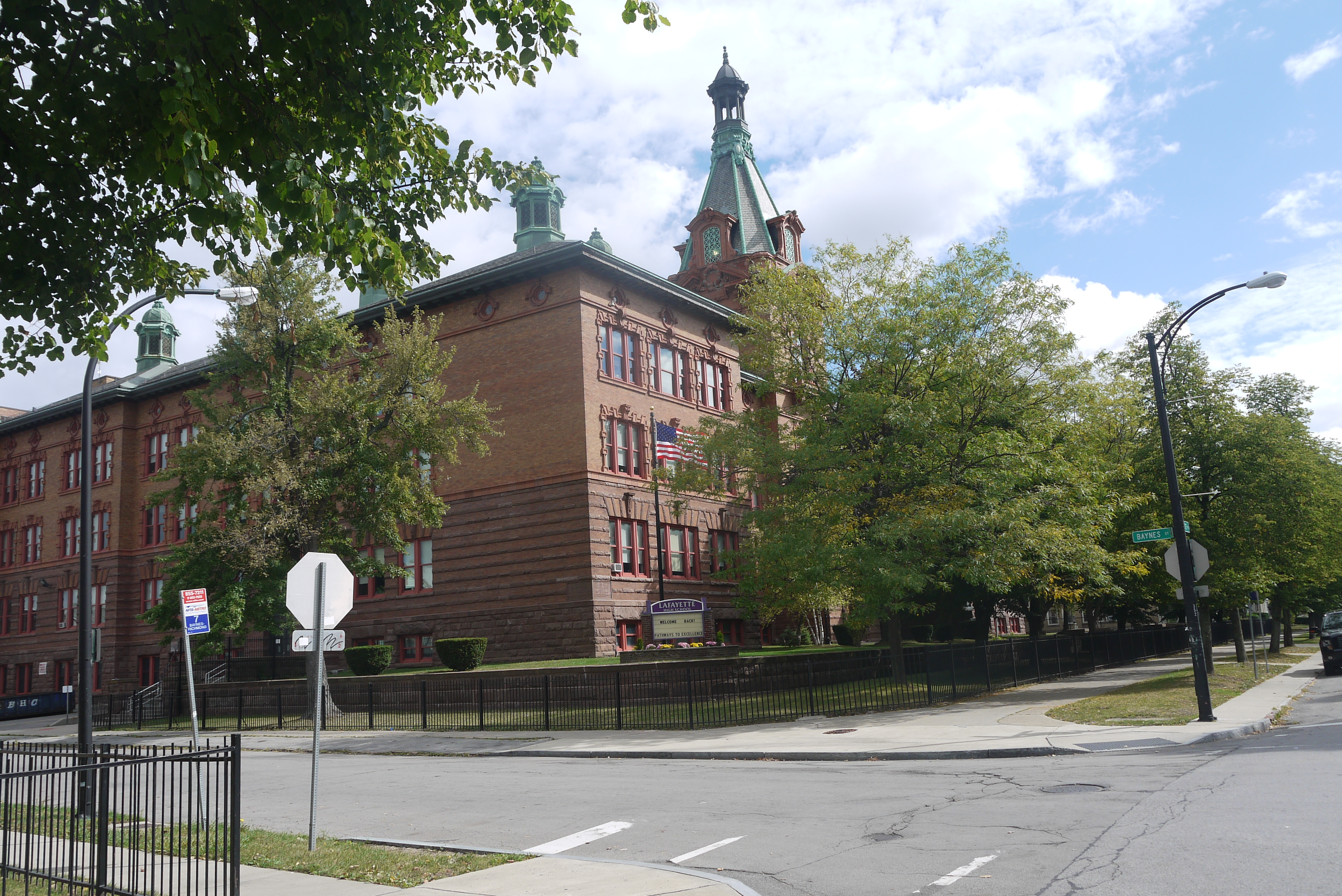 Skola sākas 8:20. Atbraucam laicīgi, kādas minūtes pirms astoņiem, Agita grib, lai es laicīgi esmu atpakaļ. Skolas priekšā pulcējas liels bērnu, nē, jauniešu bars. Skola ciet. Redzam piebraucam dzeltenos autobusus, no tiem izbirst vēl bērni, un pievienojas gaidošajiem. Skolu atver precīzi 8:20. Dodamies plūsmai līdzi, iekšā tā sadalās uz visām pusēm, bērni zin, kurp jāiet, mēs ne visai. Turpat ir Galvenais Kantoris (Main Office), klases lieluma telpa, kur apmeklētājus un darbiniekus šķir augsta lete. Sajūta kā kādā uzņēmumā, kur skraida iekšā ārā ar pavadzīmēm. Mums iedod pavadzīmi uz 322.Telpu pie Mis Kāviņsauc. Skolā nav pieņemts, ka vecāki vai citi nepiederošie klīst apkārt bez uzpurņa. Mani visžēlīgi kā pilnīgu ārzemnieku, un vienīgo, kas Kārli spēj noinstruēt, palaiž puikam līdzi. Iedod gan pavadoni līdz 3. stāvam. Braucam ar liftu, ko stūrē tāds krusttēvs Toms, ka šķiet tikko no Stovas romāna izlīdis. Lifts pats kā no mēmajām filmām, tikai krusttēva Toma iedzīve lifta stūrī nedaudz disonē. Acīm redzot večuks liftā pavada lielu dzīves daļu, un ieviesis tur ērtu zvilni ar avīžu galdiņu un radio uztvērēju.