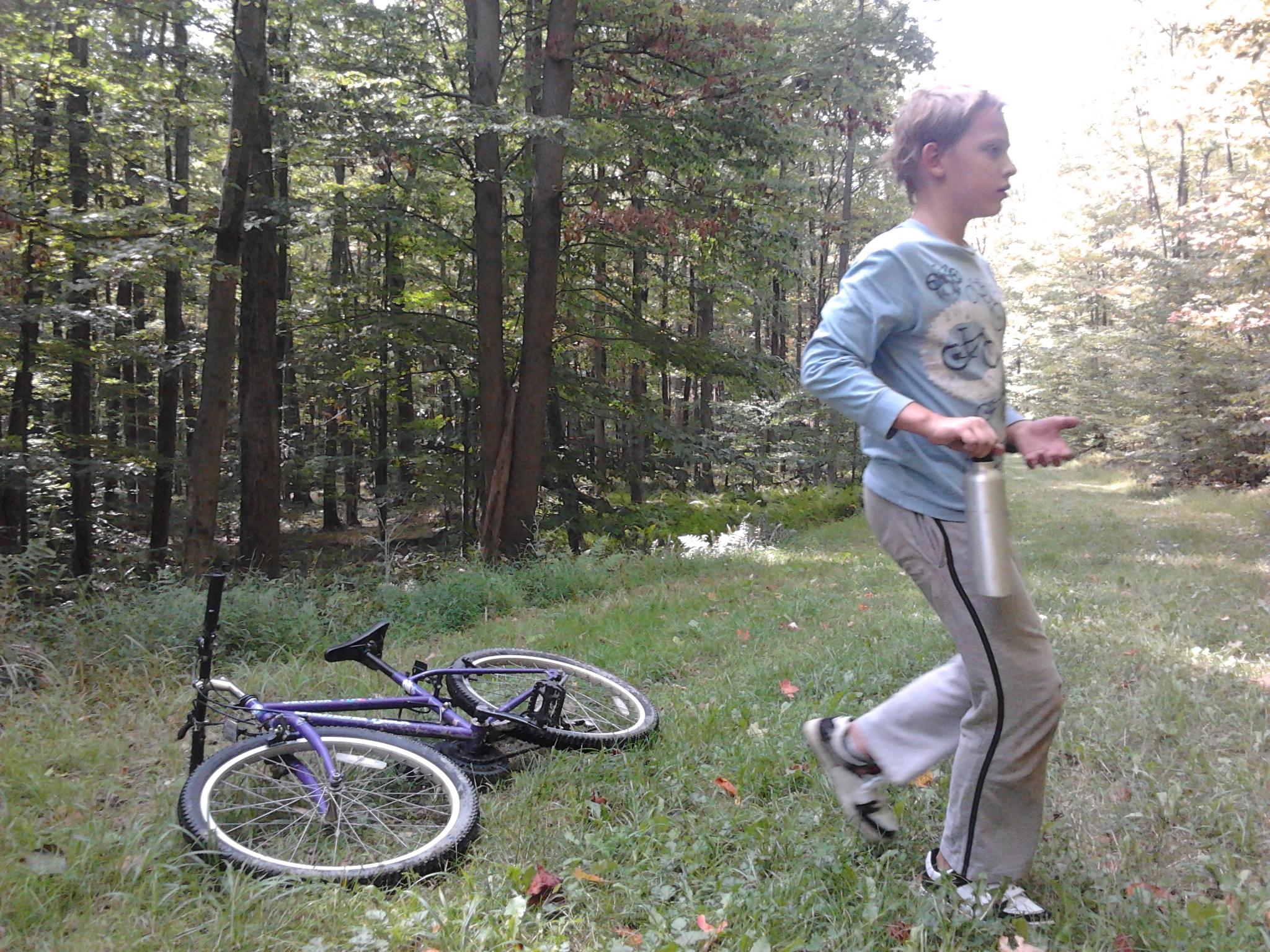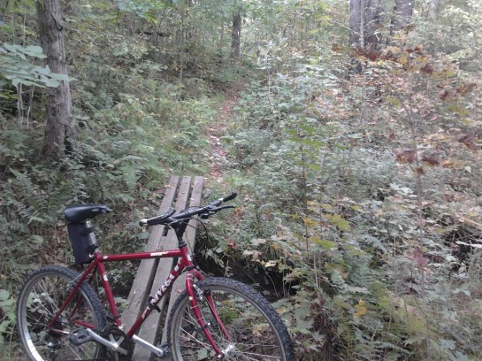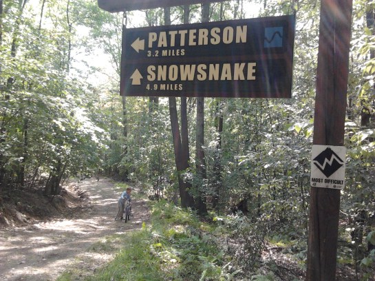 Nācās griezties atpakaļ skatus neredzējušiem. Nākošais mēģinājums bija pie viena no 4 ugunsdzēsēju novērošanas torņiem. Tornis no leņķdzelzs, sen vairs netiek izmantots mērķim, jo visu novēro no kosmosa, bet tajā drīkst kāpt. Skāde tik, ka augšējā platforma slēgta, un tieši augšējās pietrūka, lai būtu Plašais Skats. Klāvs arī droši uzkāpa līdz augšai, lejā gan bija jānes, Kārlis nemaz nekāpa! Tad mēs ar Kārli devāmies pa īsto velo taku, tādu, kas arī kartē ir atzīmēta kā velo taka. Žēl gan, ka šis velo takas ir tikai vienā apvidū, kur veido noslēgtus, radiālus apļus, nevis iet pāri visam parkam. Izvēlējāmies pēc kartes itin īsu gabalu. Kļūda. Kļūda tajā, ka mūsu taka gāja no lejas uz augšu, un pie tam vēl vijās līku loču un uz augšu un leju. Galu galā 5 jūdžu gabalā no Siguldas Gaujas kalna augstumiem laidāmies lejā kādas 6 reizes, un arī augšup devāmies tik pat daudz reižu… Ziemā šīs takas tiek izmantotas kā distanču slēpošanas trases. Zinu vienu nu jau Siguldieti, kam tās ļoti patiktu!